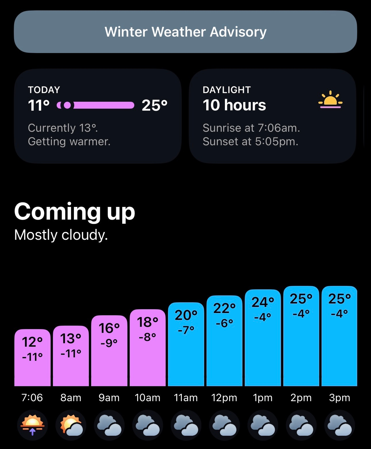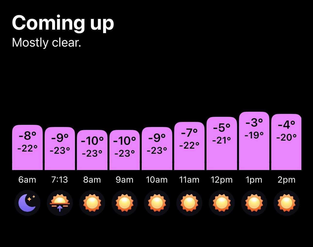 This is what a typical day has looked like for the past week. (For context: the larger number at the top of each bar represents the temperature in Fahrenheit and the smaller number beneath it represents the temperature in Celsius.)