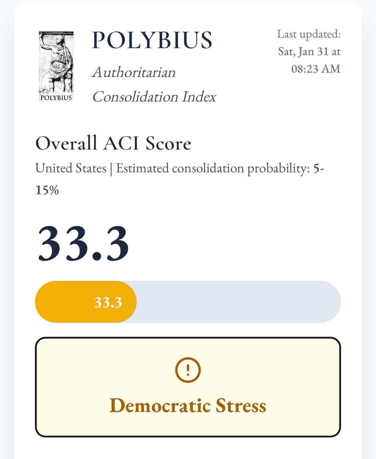 Polybius: The Authoritarian Consolidation Index (John Ganz) — An interactive poli-sci app that uses Claude to evaluate recent news against theoretical models like Linz’s “Perils of Presidentialism”, Gramsci’s hegemony, and de Tocqueville’s civil society to compute a score that measures the health of a given democracy. The app is pre-loaded with the USA’s “authoritarian consolidation index” score, but with your own API keys, you can run the analysis on any country of interest.