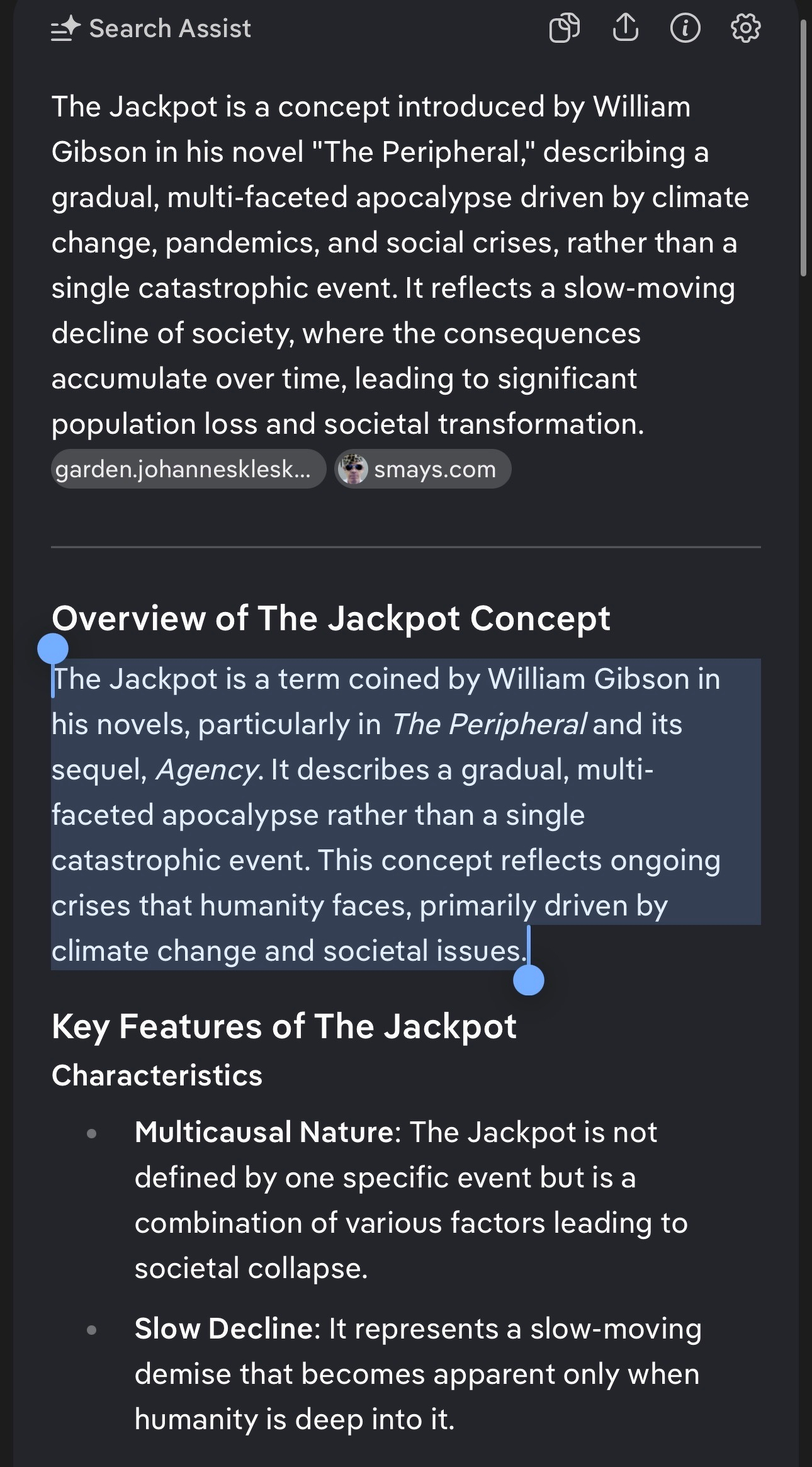 The Jackpot is a term coined by William Gibson in his novels, particularly in The Peripheral and its sequel, Agency. It describes a gradual, multi-faceted apocalypse rather than a single catastrophic event. This concept reflects ongoing crises that humanity faces, primarily driven by climate change and societal issues.